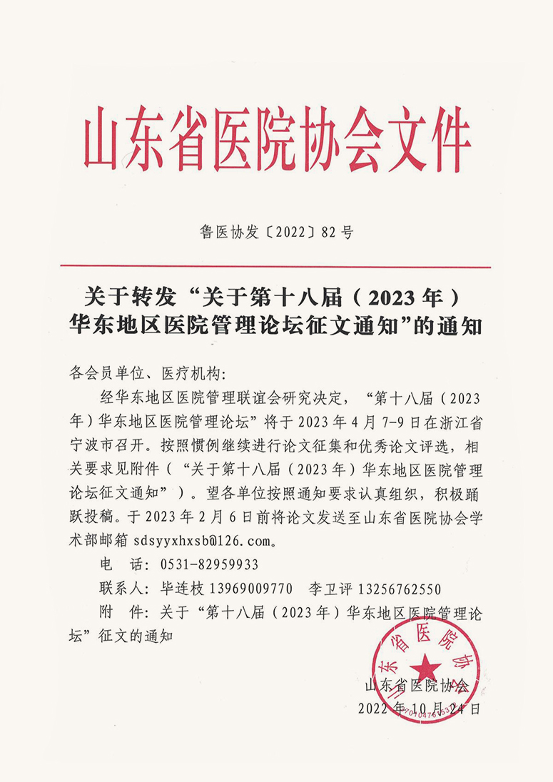 各会员单位、医疗机构: 经华东地区医院管理联谊会研究决定,”第十八届(2023年)华东地区医院管理论坛“将于2...