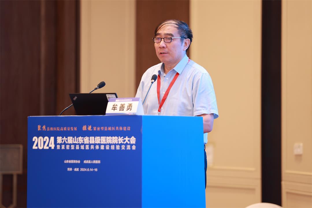 山东省卫生健康委员会一级巡视员牟善勇讲话。他强调,紧密型县域医共体建设是深化医改重要内容,是推进基层卫生健康事业高质量发展最有效的措施之一,代表着当前和今后一个时期县域深化医改的发展方向。前不久,省政府在成武县召开了全省乡村医疗卫生服务能力提质提效三年行动西部片区会暨全面深化紧密型县域医共体建设现场推进会,陈平副省长对紧密型县域医共体建设提出了明确目标和具体要求。今天的会议,授课老师权威,课程内容丰富,既有卫生健康行政部门领导,也有相关领域专家,将在改革方向、具体政策等方面,全面系统地为我们传经送宝。