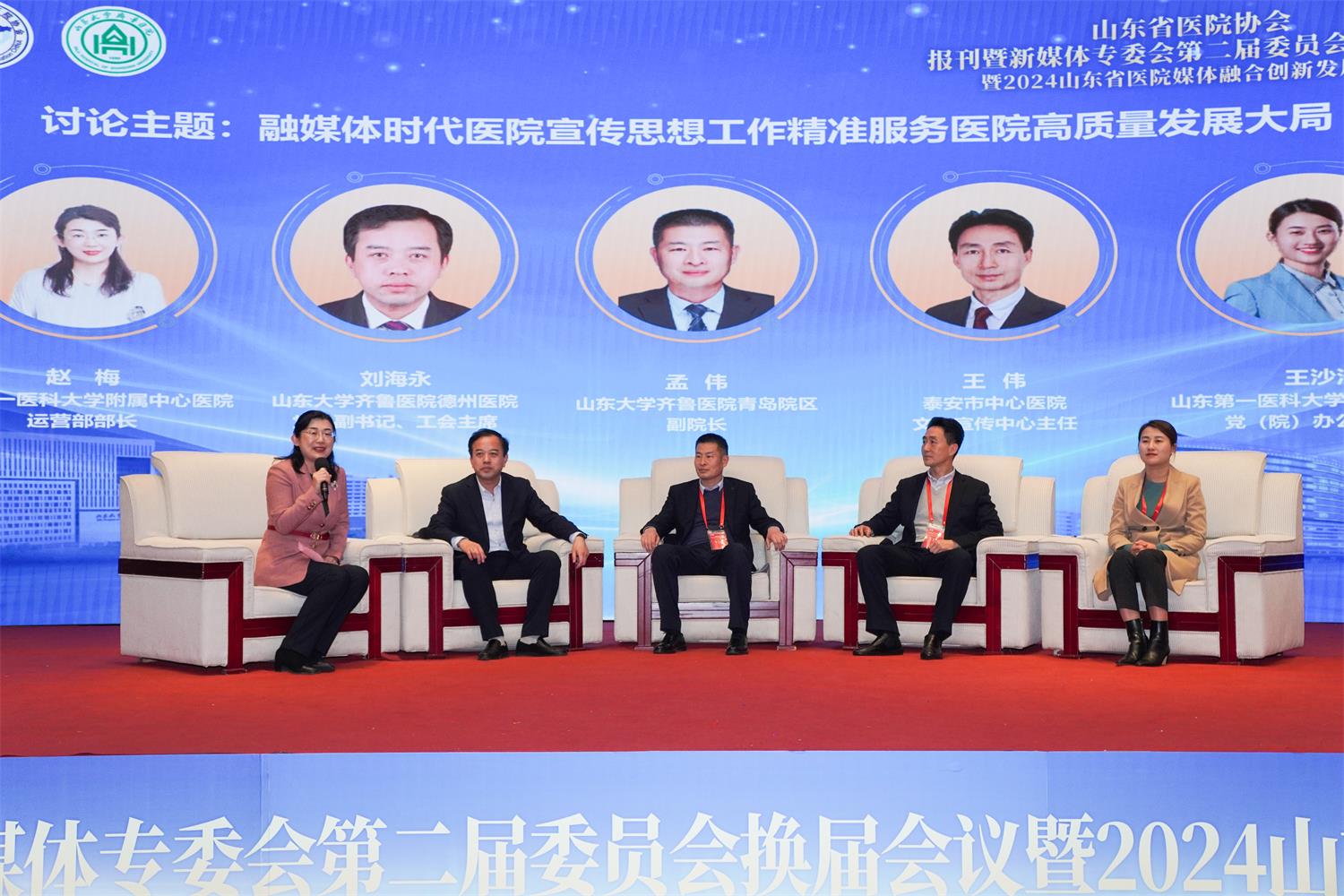 会议期间,开设了以“融媒体时代医院宣传思想工作精准服务医院高质量发展大局”为题的圆桌论坛。山东大学齐鲁医院德州医院副书记刘海永、山东大学齐鲁医院青岛院区副院长孟伟、泰安市中心医院文化宣传中心主任王伟、山东第一医科大学附属肿瘤医院党(院)办公室主任王沙沙进行讨论交流,济南市中心医院运营管理办公室主任赵梅主持论坛。