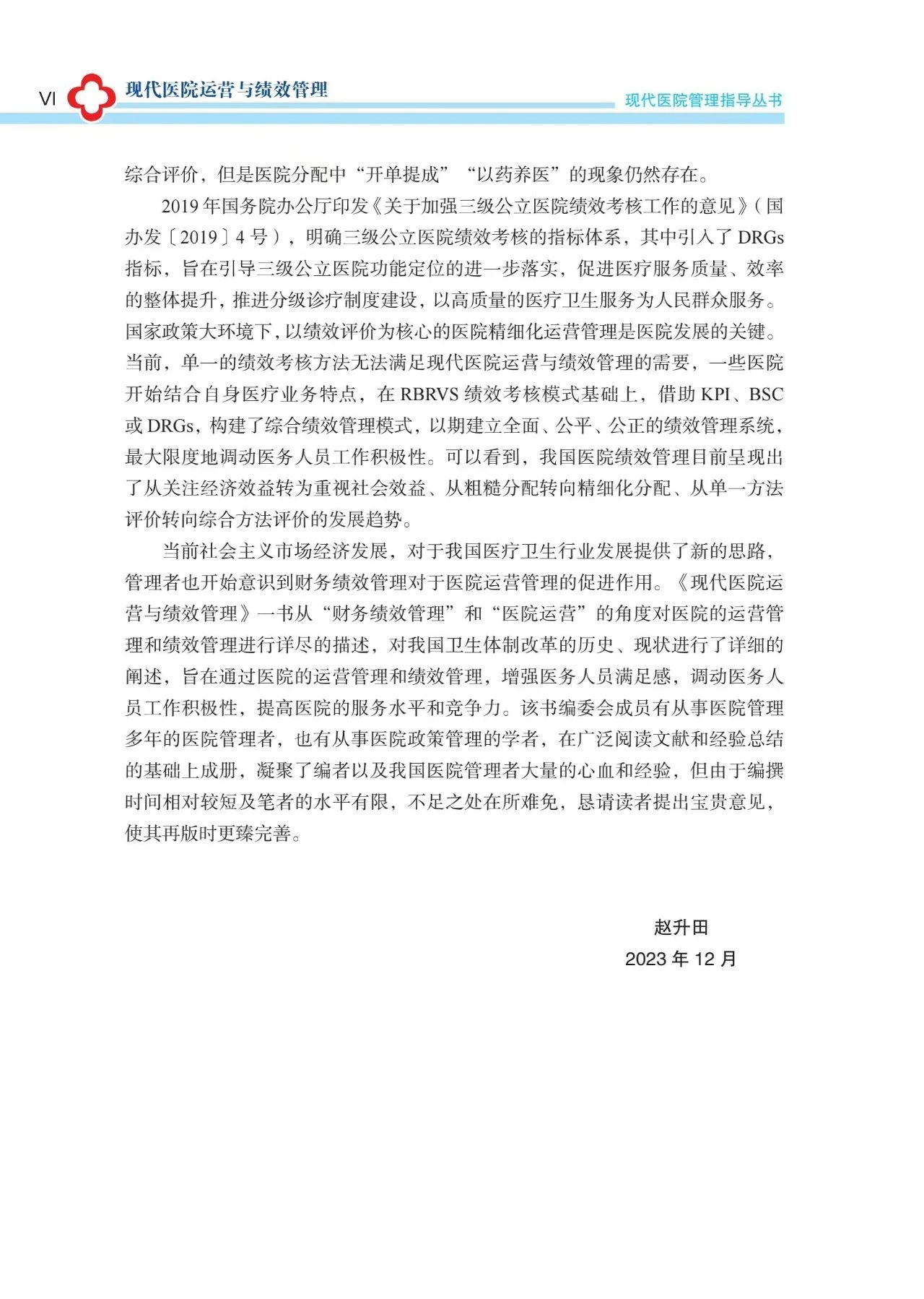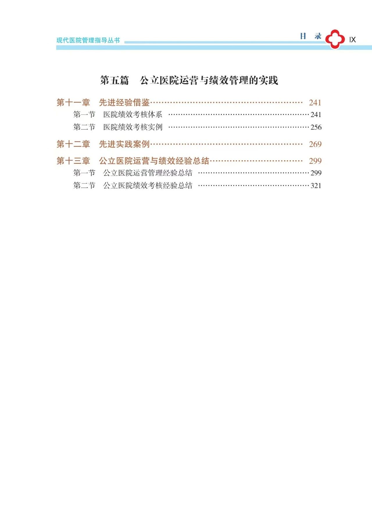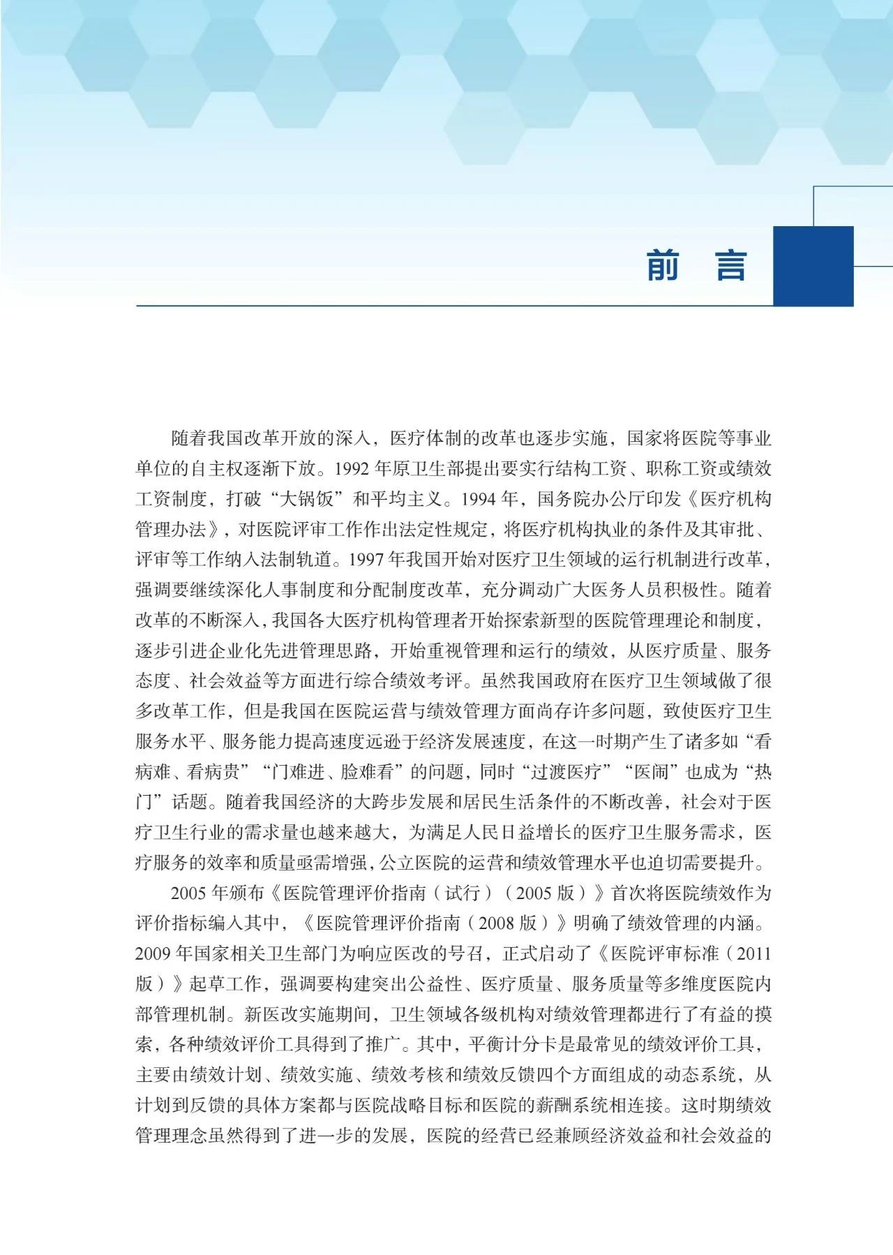 医院运营与绩效管理是现代医院管理的重要抓手,涉及医院管理的各个方面,是一个复杂且关键的重要过程,是提升医院运行效率、医疗质量和服务水平的重中之重,是促进现代医院高质量发展的核心。2019年国务院办公厅印发的《关于加强三级公立医院绩效考核工作的意见》明确提出要引导公立医院功能定位,促进医疗服务质量、效率的整体提升。随着医疗改革的深入和医疗技术的不断发展,医院运营与绩效管理将面临新的挑战和机遇。未来医院运营与绩效管理将更加注重数据驱动和智能化管理,通过大数据、人工智能等技术手段来提升医院的运营效率和服务质量。同时,医院也将更加注重社会责任和公益性,通过绩效管理来推动医院的高质量发展。