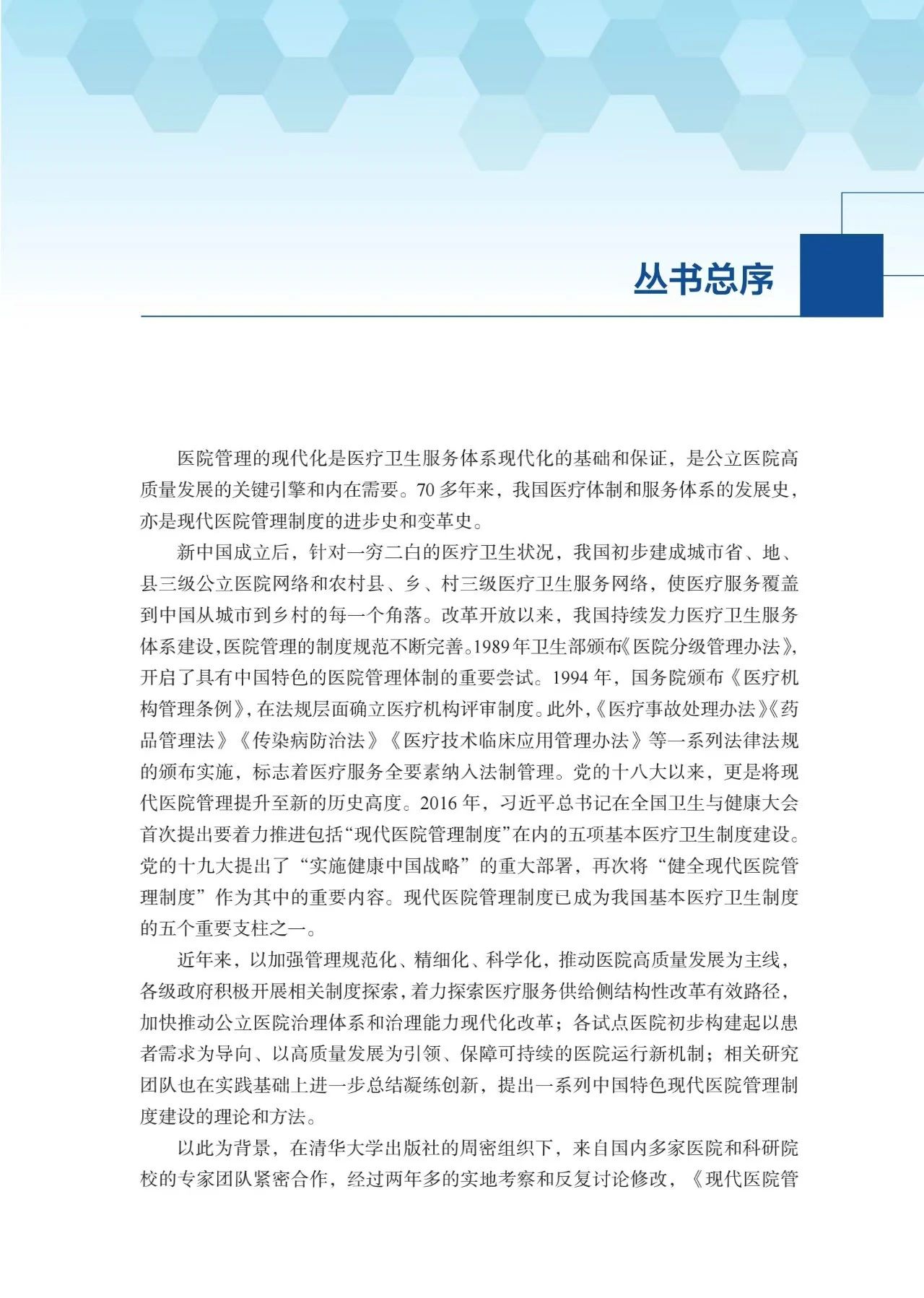 在此背景下,清华大学出版社组织出版《现代医院管理指导丛书》,本套丛书由清华大学医院管理研究院常务副院长张宗久教授担任总主编,分册分别从医保、文化、绩效、人才培养和学科建设、评审等方面来展开,突出“现代”和“指导”,体现了国家的新政策、新法规,编委团队权威,具有指导意义。本套丛书的出版将有益于推动医院管理现代化、推动公立医院高质量发展和健康中国建设。