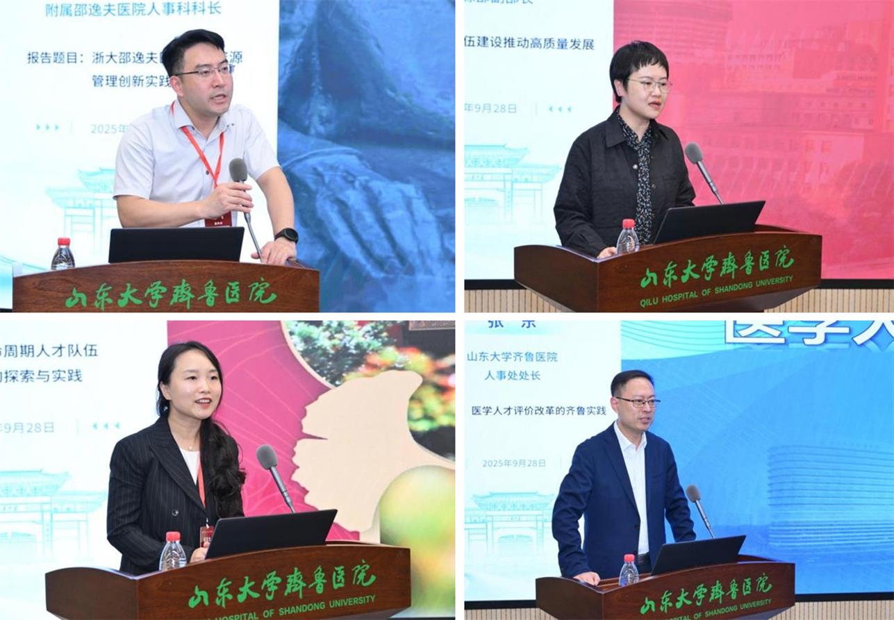 在专题报告阶段,浙江大学医学院附属邵逸夫医院人事科科长潘飞以“浙大邵逸夫医院人力资源管理创新实践与思考”为题,介绍了医院在人才引进、绩效考核与职业发展等方面的创新举措;中南大学湘雅医院人力资源部副主任兼人才工作办公室主任刘园园以“人才队伍建设推动高质量发展”为主题,阐述了湘雅医院以人才驱动医院转型升级的实践路径;四川大学华西医院人力资源部副部长蒋莉华围绕“全生命周期人才队伍建设的教学与实践”,分享了华西医院在人才梯队建设与终身培养体系中的探索;张东结合齐鲁医院实践作“医学人才评价改革的齐鲁实践”专题报告,展现了齐鲁医院人才评价体系构建的做法与成果。专题报告环节分别由青岛大学附属医院人力资源部主任黄霞、山东大学齐鲁第二医院人力资源部(人才办公室)主任金苏芹、山东省口腔医院(山东大学口腔医院)人事部部长杜密主持,现场反响热烈,学术氛围浓厚。