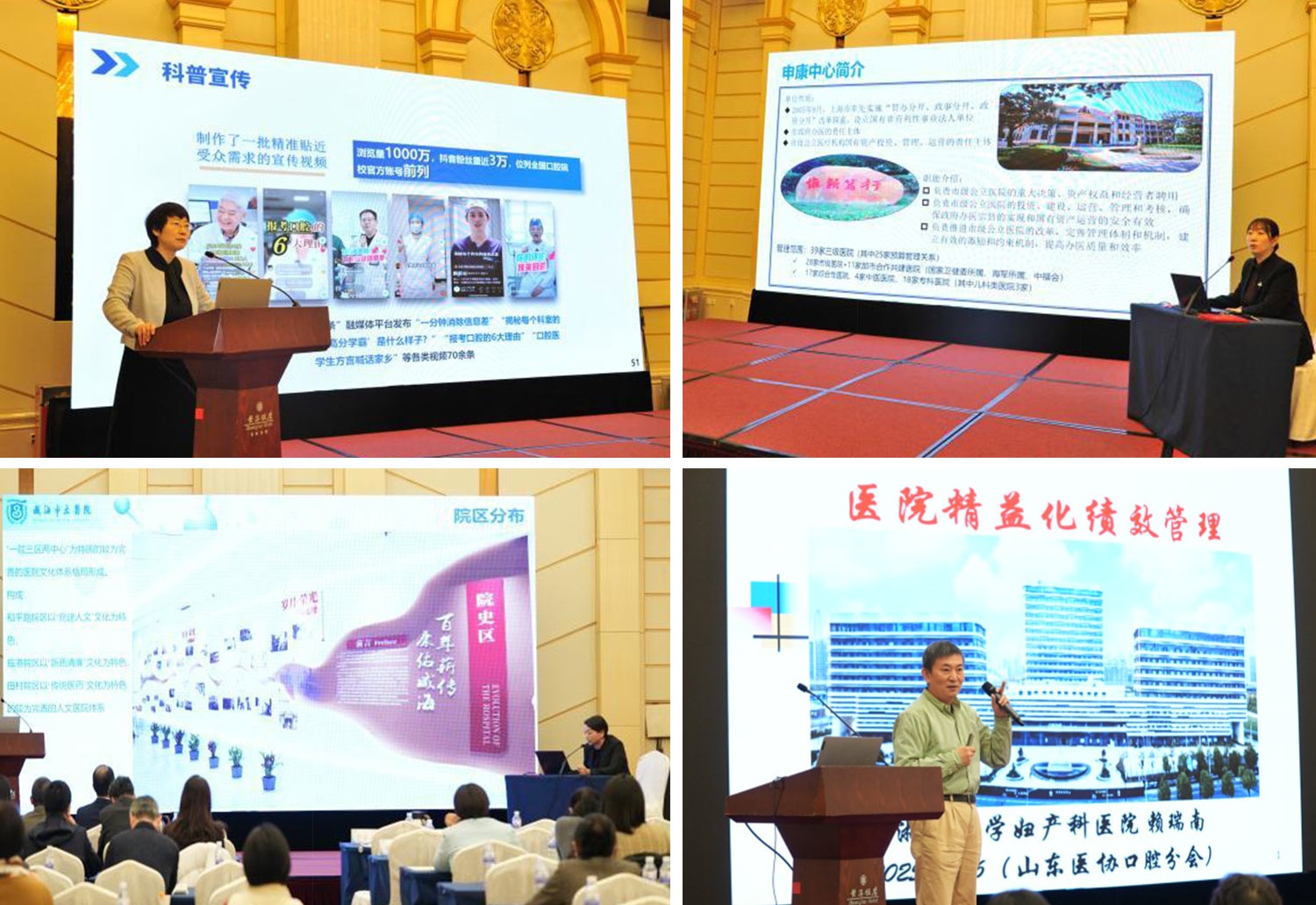 学术讲座环节多名专家学者带来精彩纷呈的学术报告。山东大学口腔医院院长葛少华以《聚势赋能特色发展—新时代背景下山大口腔学科建设新征程》为题,系统分享了山大口腔医院在学科顶层设计、科研创新与人才培养方面的战略布局与实践,其以高水平科研引领临床发展的路径,为省内口腔学科建设树立了标杆。上海交通大学医学院附属仁济医院总会计师陈志军作了题为《精益运营管理助力医院高质量发展》的讲座。她结合国家卫健委经济管理领军人才的视角与丰富实践,深入阐述现代医院精益化运营管理的核心逻辑与工具,其前沿理念为口腔专科医院提升资源效益与管理精细化水平提供重要借鉴。威海市立医院总会计师韩杰带来《高质量发展为导向,RBRVS与病种结合的医院绩效改革实践》为题的学术报告。她基于扎实的模型研究与医院实践,详解了如何将RBRVS与病种管理相结合,构建科学、公正的绩效分配体系,为公立医院应对医保支付方式改革、实现内涵式发展提供了可操作的解决方案。浙江大学医学院附属妇产科医院副院长赖瑞南带来了《医院精益化的绩效管理》的深度分享。凭借其数十年的医院管理经验与理论研究,他从“制度约束”到“文化引领”的演进角度,剖析了绩效管理的核心与境界,其深刻洞见启发了管理者对绩效改革价值导向的再思考。在专题交流环节,魏福兰、孙红颖、张世周、宋明文、杜毅、华茜、唐天乙、李志荣等专家,分别围绕医院文化、护理人才培养体系构建、专病中心建设、民营口腔管理、实验室平台建设、6S管理、数智化运营等主题进行了简短而精辟的分享,从多维度展现了口腔医疗领域创新实践的蓬勃景象。