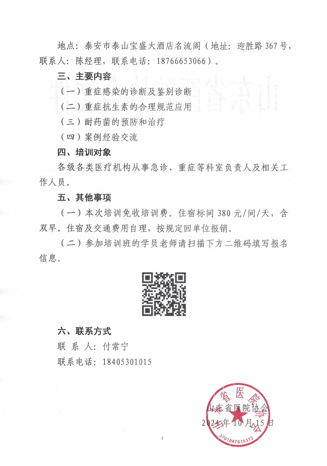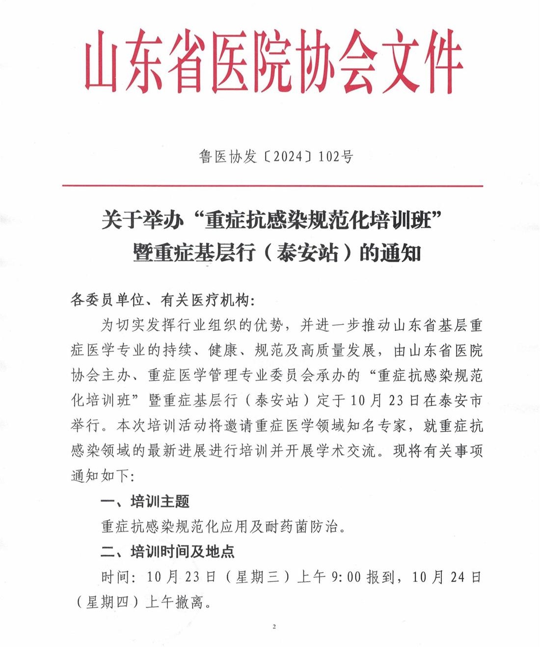 鲁医协发〔2024〕102号关于举办“重症抗感染规范化培训班”暨重症基层行(泰安站)的通知