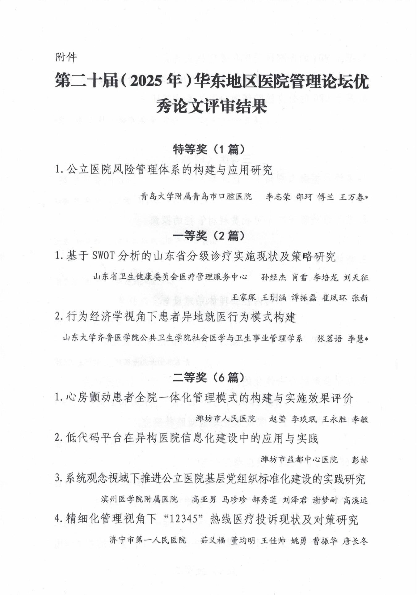 第二十届(2025年)华东地区医院管理论坛优秀论文名单公示
