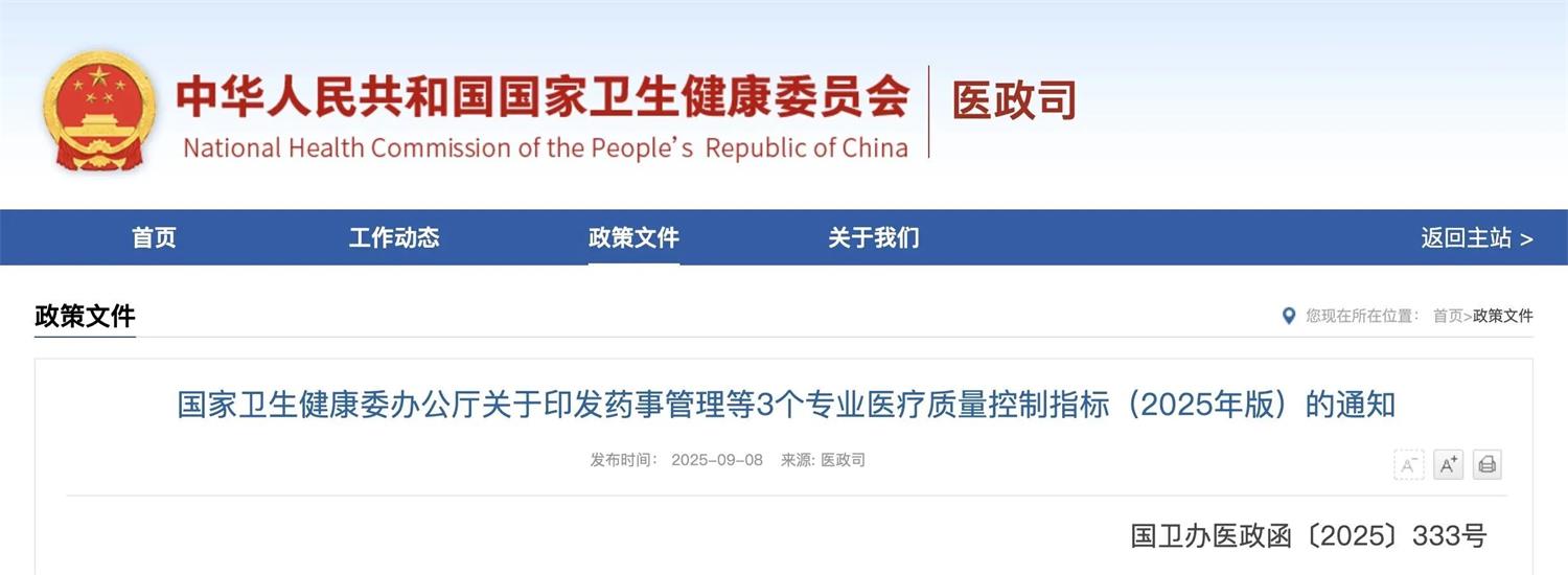为进一步加强医疗质量管理,规范临床诊疗行为,提升医疗服务同质化水平,我委组织对药事管理和临床检验专业医疗质量控制指标进行修订,新制定了核医学专业医疗质量控制指标,形成了药事管理等3个专业医疗质量控制指标(2025年版,详见附件1、2、3)。现印发给你们,供各级卫生健康行政部门、相关专业质控组织和医疗机构在医疗质量管理与控制工作中使用。本通知自印发之日起施行。2015年3月31日印发的《临床检验专业医疗质量控制指标(2015年版)》(国卫办医函〔2015〕252号)和2020年8月4日印发的《药事管理专业医疗质量控制指标(2020年版)》(国卫办医函〔2020〕654号)同时废止。