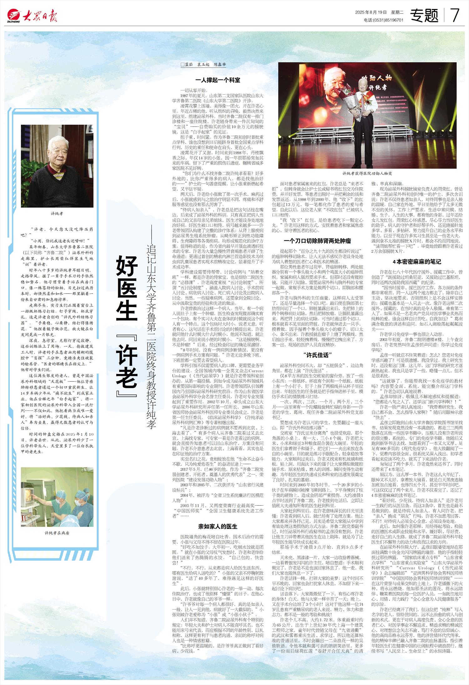 许老已经离开了我们,但这位把“纯粹”写入名字的老人,留给世间的,远不止治愈的病人与创新的术式,更在于对病人高度负责、全心全意的医者仁心,对医学事业不懈追求、精益求精的精诚匠心,对理想信念矢志不渝、笃行不怠的信仰诚心。他的高尚品格永远芬芳,他的济世情怀代代传承,他的精神丰碑已融入齐鲁二院的血脉基因,指引着年轻医生们在健康中国的壮阔航程中破浪前行,继续书写“人民至上、生命至上”的永恒诗篇。