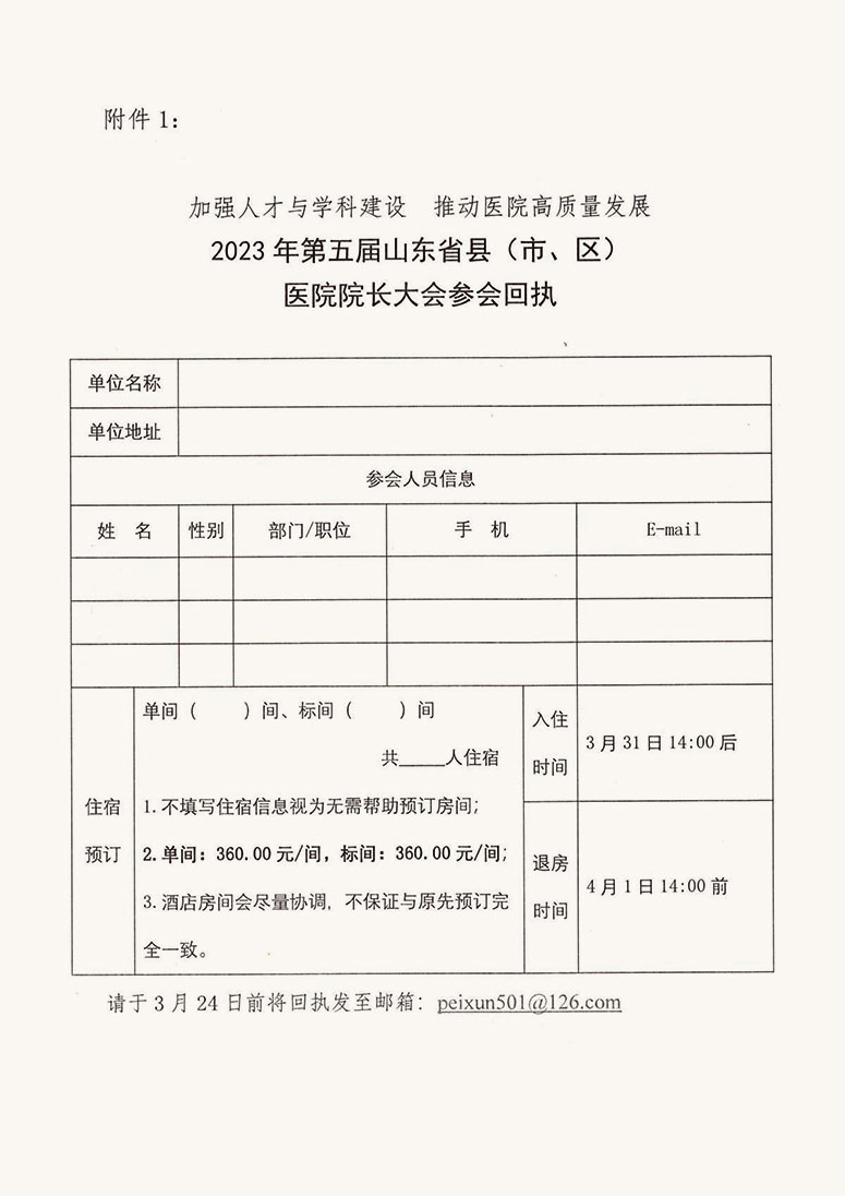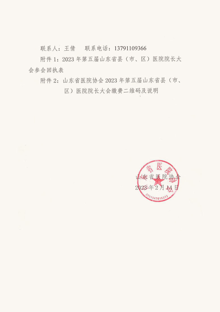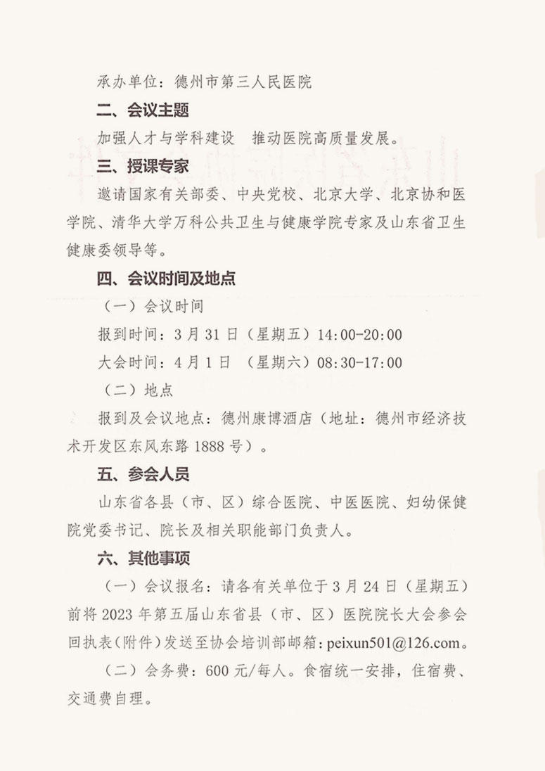 为深入学习和贯彻党的二十大精神,全面推进新时期公立医院高质量发展,推动建设优质高效的医疗卫生服务体系定于2023年3月31~4月1日在德州市召开2023年第五届山东省县(市、区)医院院长大会。大会以习近平新时代中国特色社会主义思想为指导,以加强人才与学科建设为主题,以贯彻新发展理念,构建新发展格局,推动高质量发展为主线,坚持人才兴院、学科强院的发展观念,探索新时期医院高质量发展的新理念、新举措。