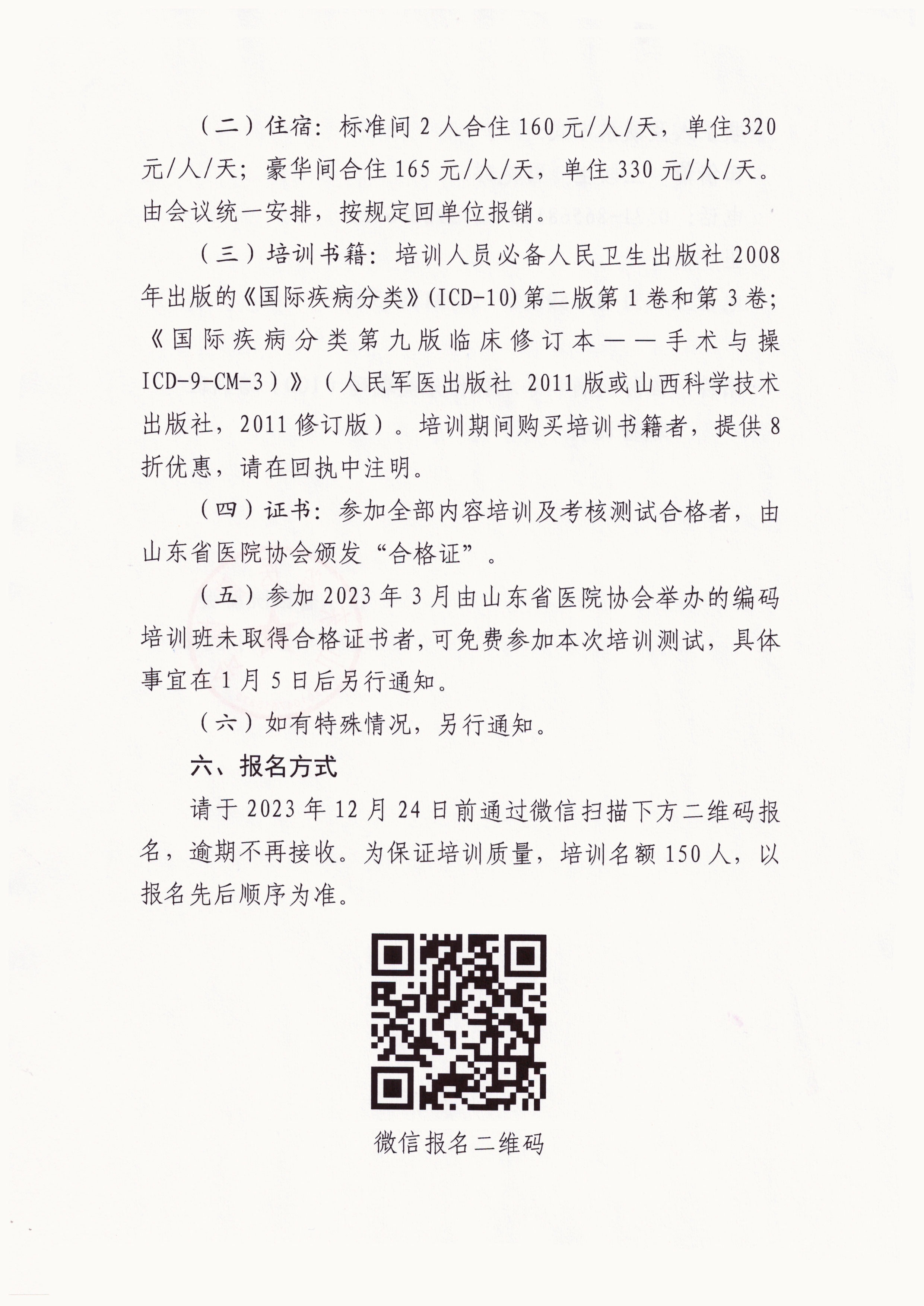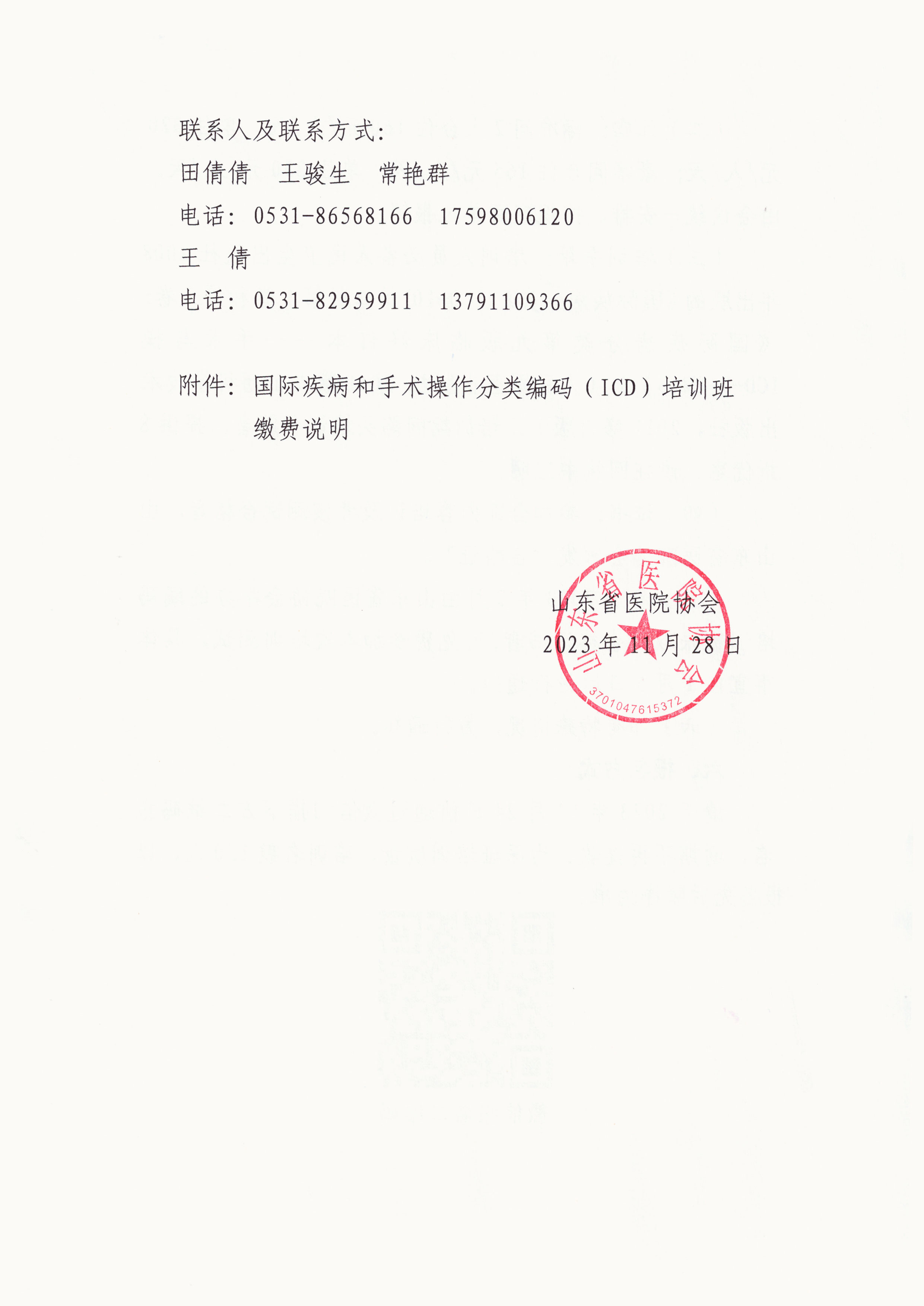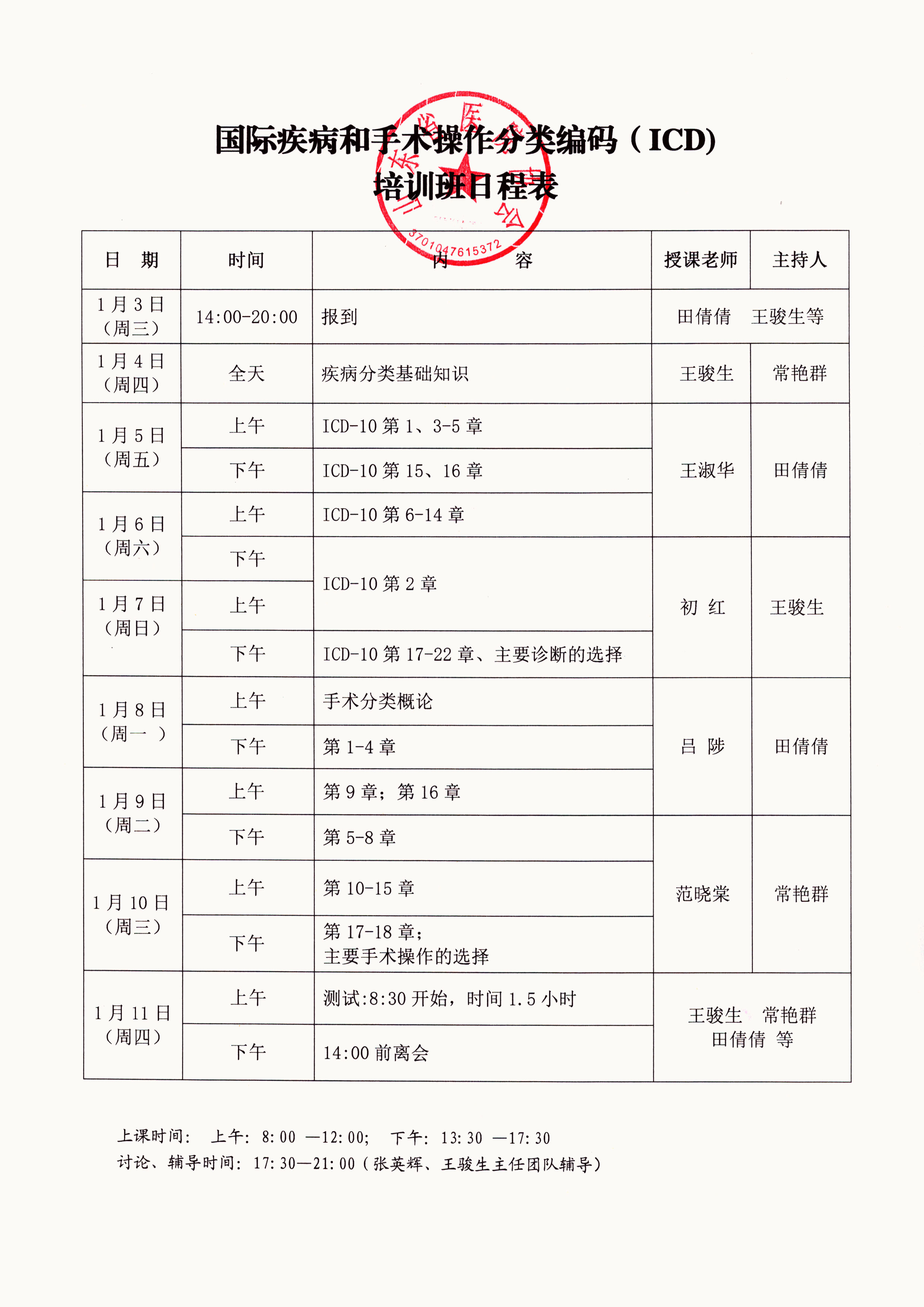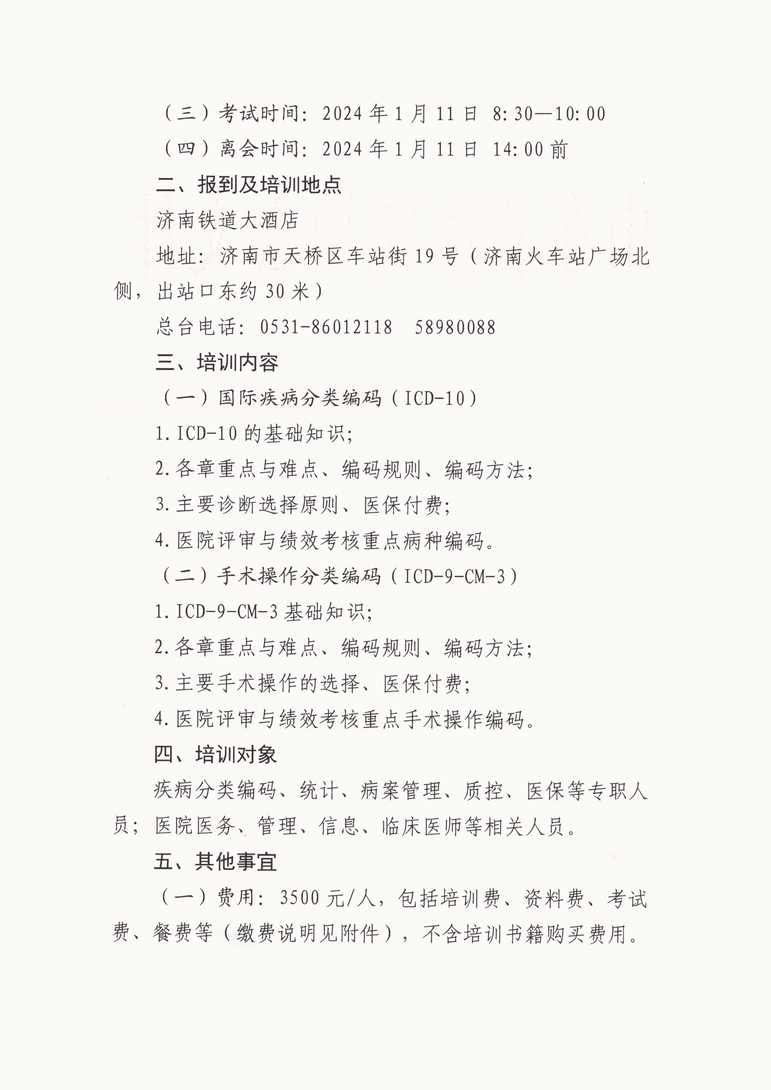 为提高病案和医疗质量管理水平,真正掌握和提升相关人员疾病和手术操作分类编码及使用能力,满足医保DRG/DIP及单病种付费、医院等级评审、二级和三级公立医院绩效考核、医院高质量发展评价、医院医教研和内部精细化管理等需求,定于2024年1月3日至11日在济南举办“国际疾病和手术操作分类编码(ICD)培训班”,并在培训结束时组织考核测试。