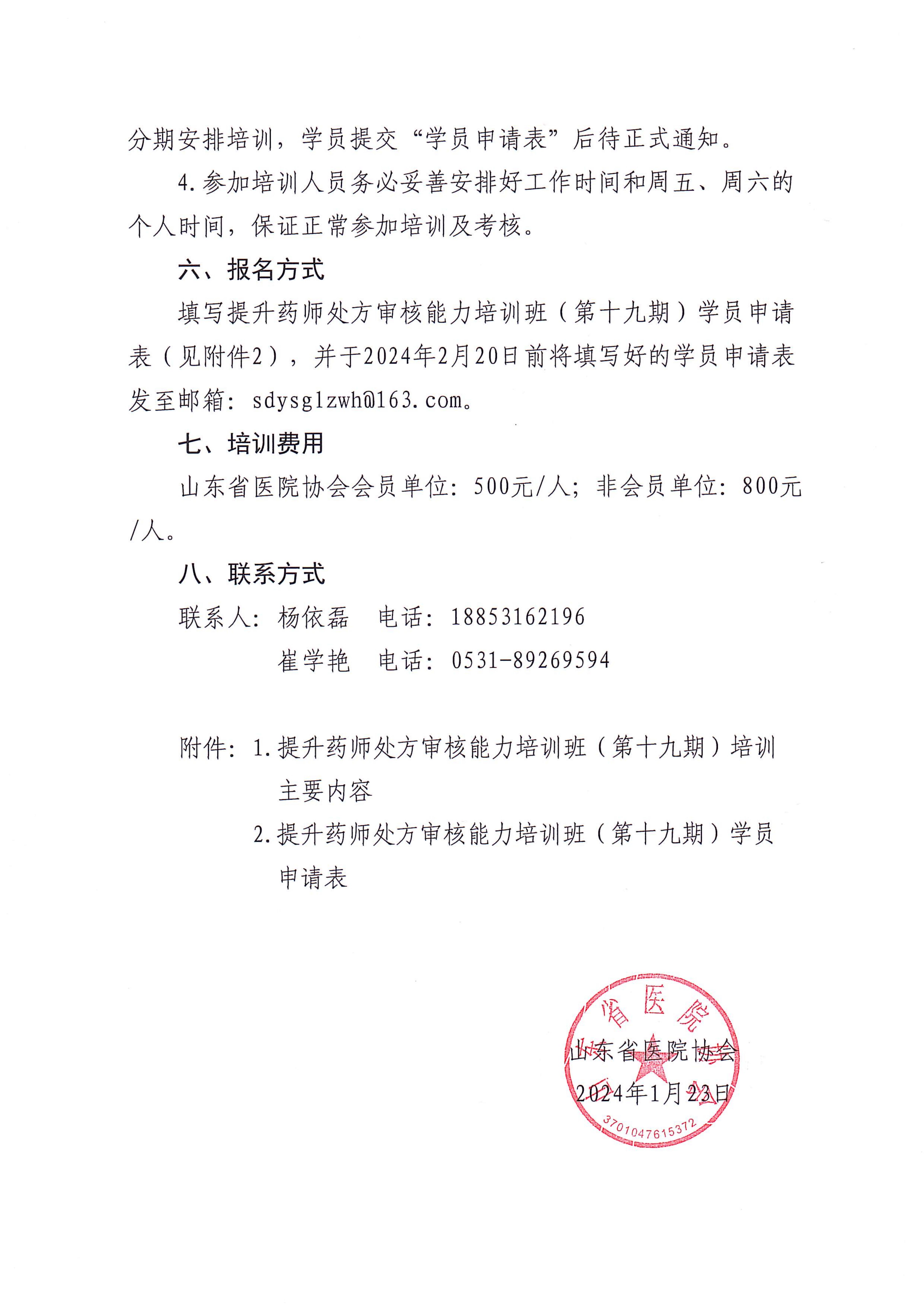 《关于印发医疗机构处方审核规范的通知》(国卫办医发〔2018〕14号)第六条:“药师是处方审核工作的第一责任人。”为了进一步提高医疗机构药师处方审核能力,举办提升药师处方审核能力培训班(第十九期),旨在通过培训,使药师进一步掌握处方审核的基本原则、思路和审核要点,提高依据相关法律法规、规章制度与技术规范进行处方审核的能力,提高其发现存在的或潜在的用药问题和解决临床实践问题的能力,更好地参与到处方审核工作中,保障患者用药安全,提高医疗质量,提升服务水平。培训班也为山东省内药师搭建起一个学习交流的平台,通过平台分享审方实践工作中的经验,促进更深入、更广泛地开展合理用药工作。