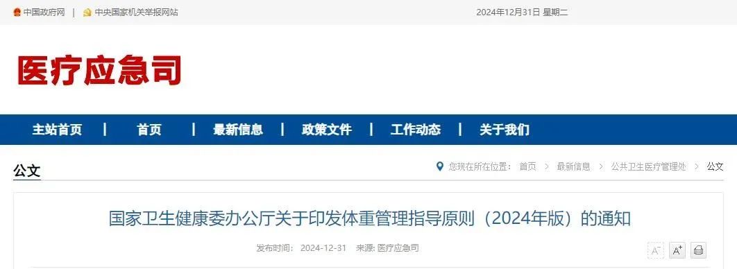 为进一步落实《“体重管理年”活动实施方案》,倡导文明健康生活方式,指导医疗卫生人员科学开展体重管理工作,我委组织制定了《体重管理指导原则(2024年版)》,现印发给你们,供推广使用。